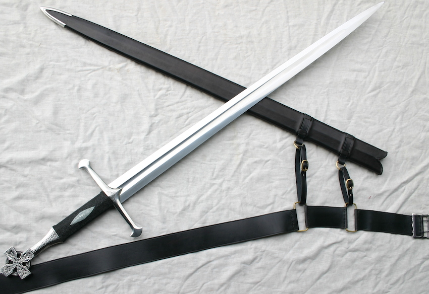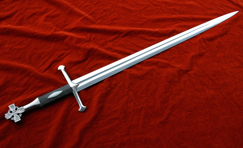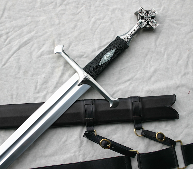The oak grip is covered with black ray skin for grip and aesthetics.pommel is carved as a Celtic cross with knotwork panels.A simple triskel knot on the guard face.