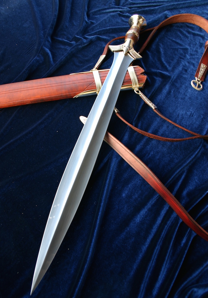 the scabbard is calfskin over poplar wood,with some light decorative detailing,the suspension and belts heavily detailed with Celtic design work.