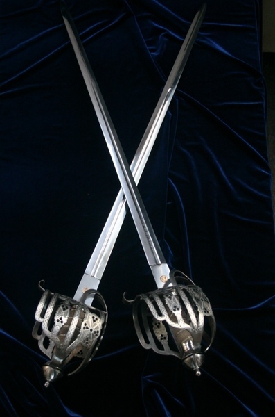 This piece is inspired by the Stirling Basket hilts attributed to the Allen Family. An extraordinarily detailed work, the raised steel basket is chiseled and inlaid with pure silver wire then incised and polished. Likewise, the pommel is chiseled and inlaid, while the grip is made from ray skin and silver wire with silver collars top and bottom. The blade itself is narrow, double edged and single fullered with a ricasso for optional coin or etching. The scabbard is made to match the sword - ash with molded and hand stitched calfskin, silver chape and locket and an ornate sterling silver buckle.