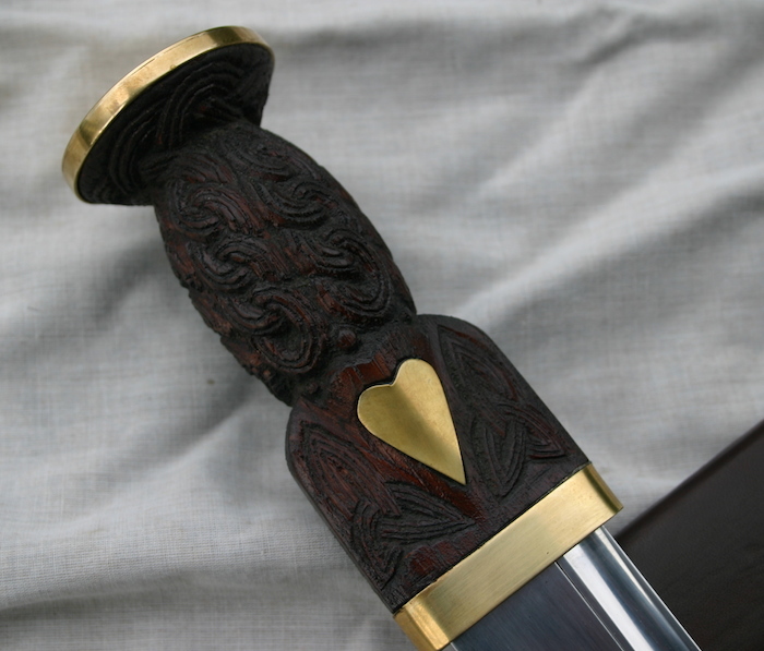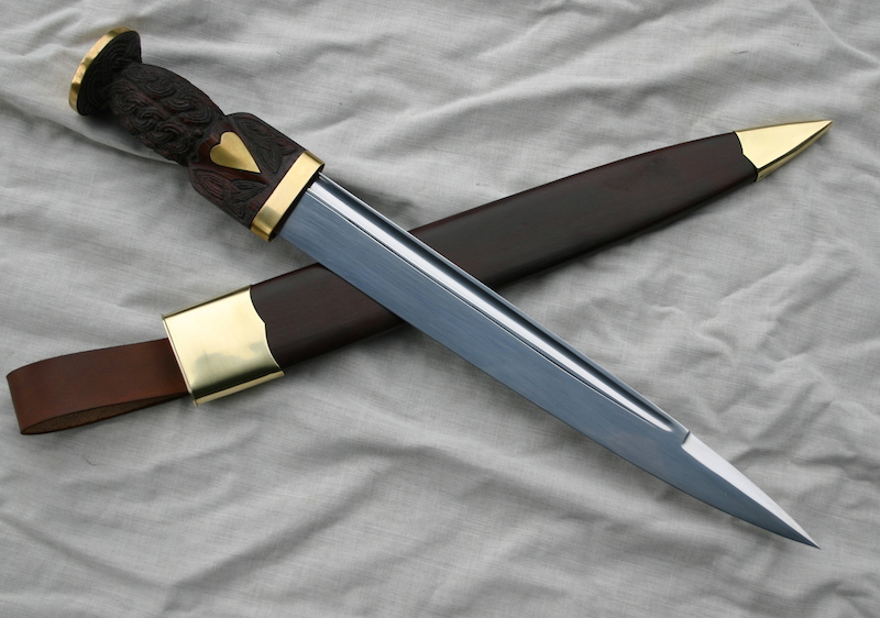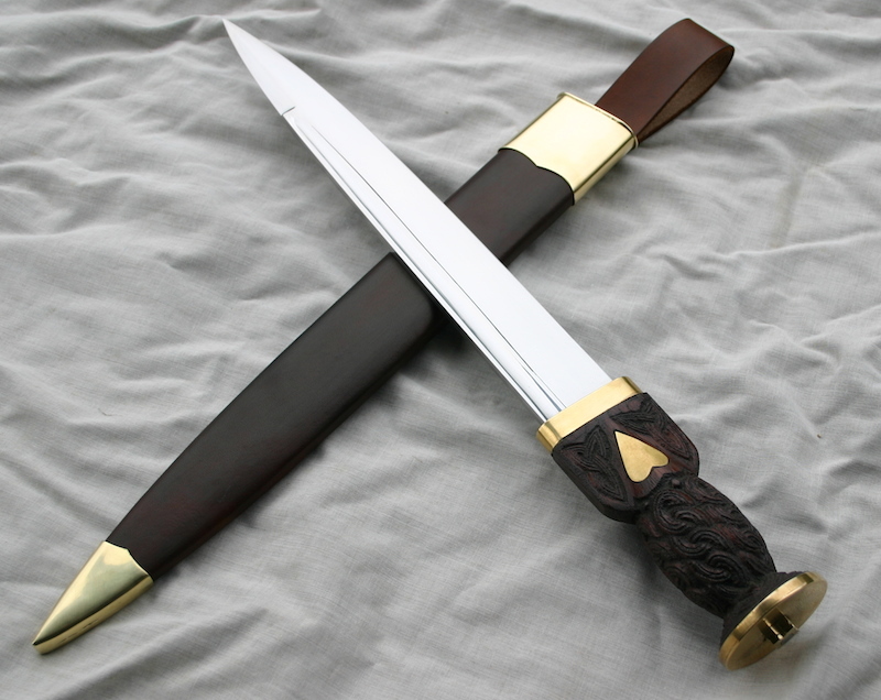 Celtic carved Oak grip with inlaid hearty motifs.13” blade with false back edge and fullering.includes sheath