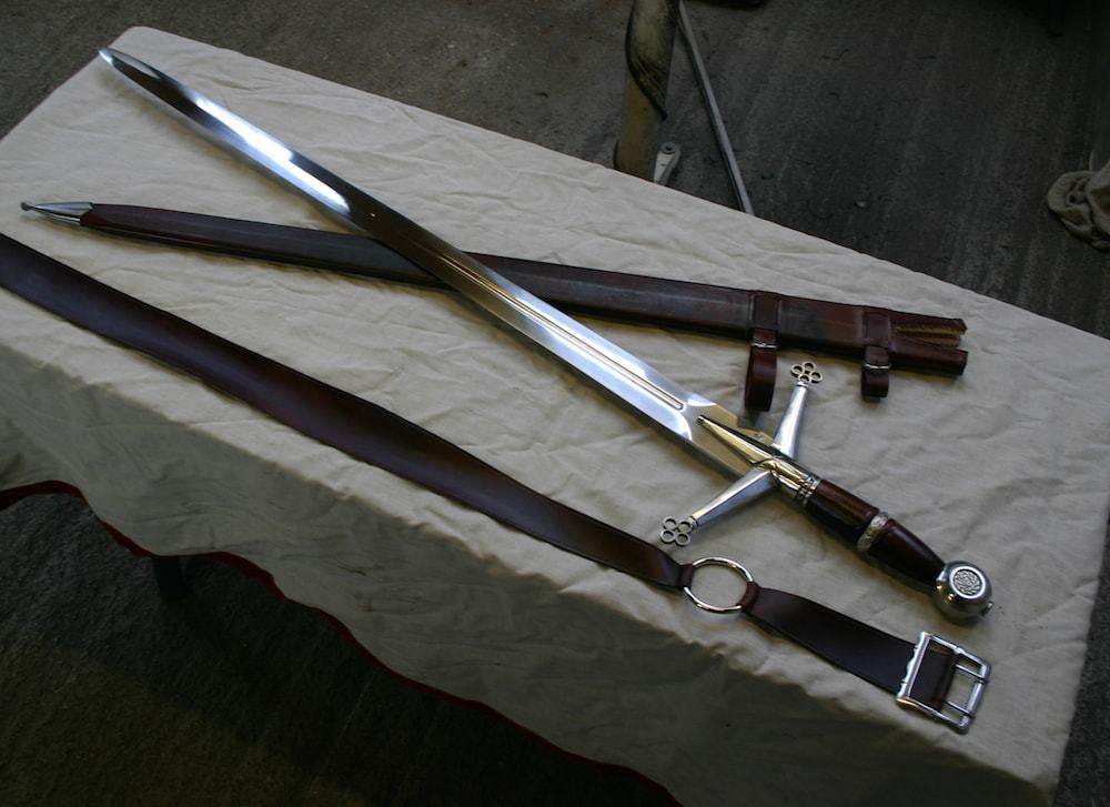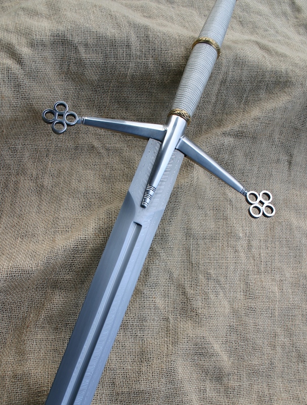 I offer the basic sword with an oak ,leather or ebony grip, but you may also choose to have a Celtic knotwork grip ring in silver, inlaid pommel coins or etching on the blade itself as additional details.