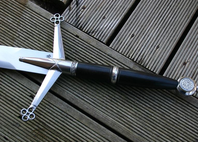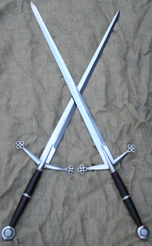 The Scottish Claymore is thought to have developed from the lowland gallowglass sword. The typical style that you see here is an elaboration on the original form where the ends of the down turned quillons are pierced with quatrefoils and the langet, or tongue, is extending down the blade itself. The Claymore was in use from the 14th century right up until the Battle of Culloden and remains the definitive Scottish sword.