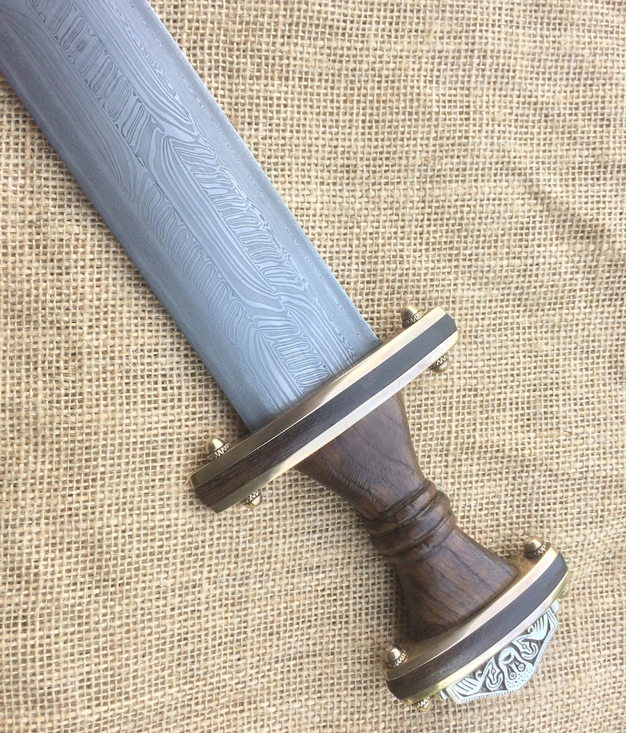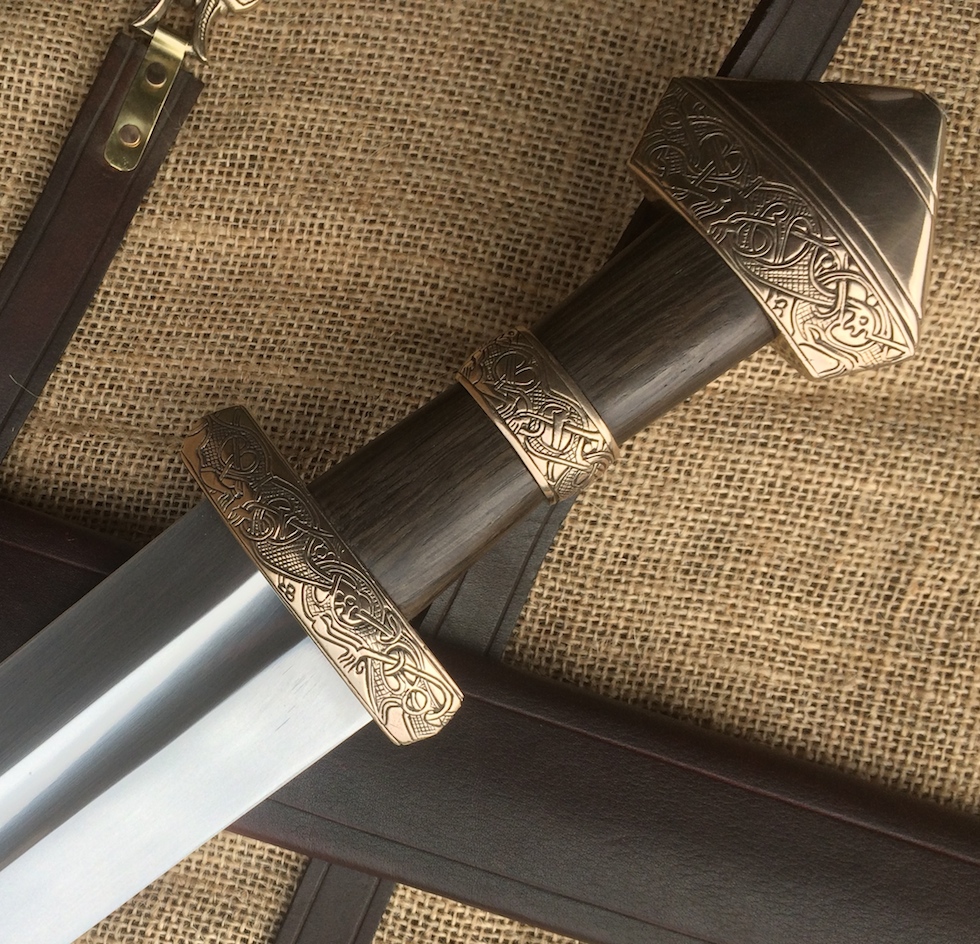 Grips are generally made from hardwood, either leather or wire bound, also twine binding with calfskin - all of which are authentic methods. The pommel can be inset with silver or bronze coins upon request, made and cast from your design. Likewise, the blade can be decorated with etching to order. I use the traditional method of cutting into beeswax and laying on acid to achieve a deep pattern, all performed freehand.