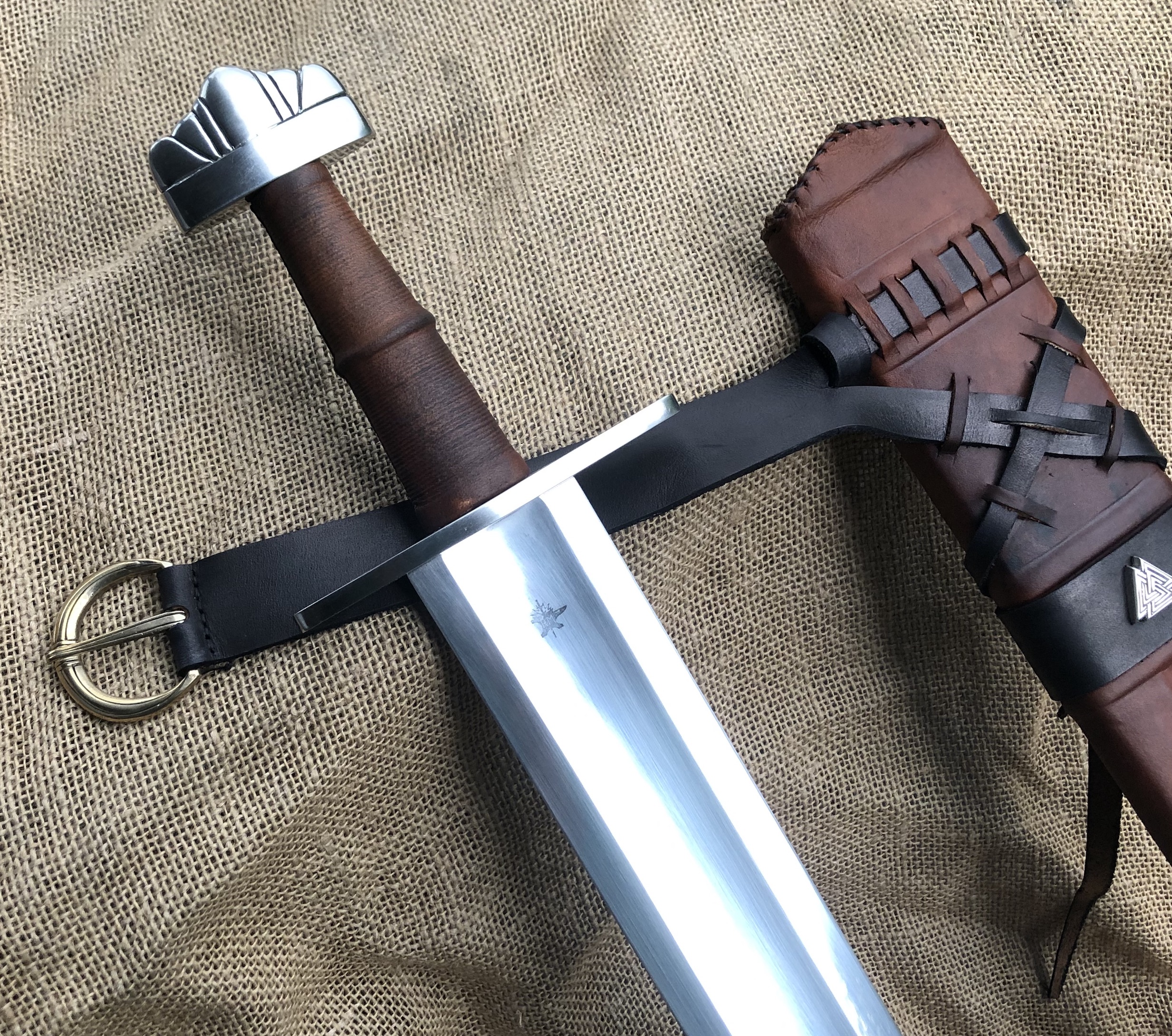 A sword of the 10-11th century, Broad fullered blade with lobated pommel and straight crossguard. the grip is cord bound with leather.