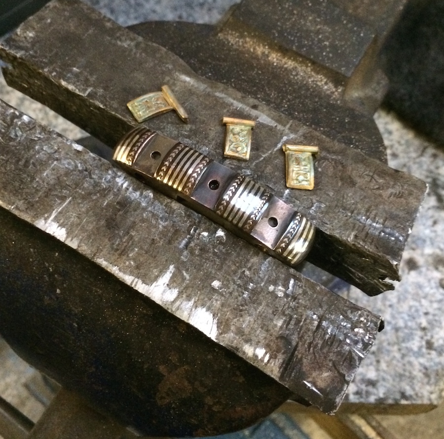 The grip was ornamented with a silver ring ,again inlaid with the same features,and collars similar to another contemporary piece,a theme that i continued through the silver and bronze scabbard fittings.