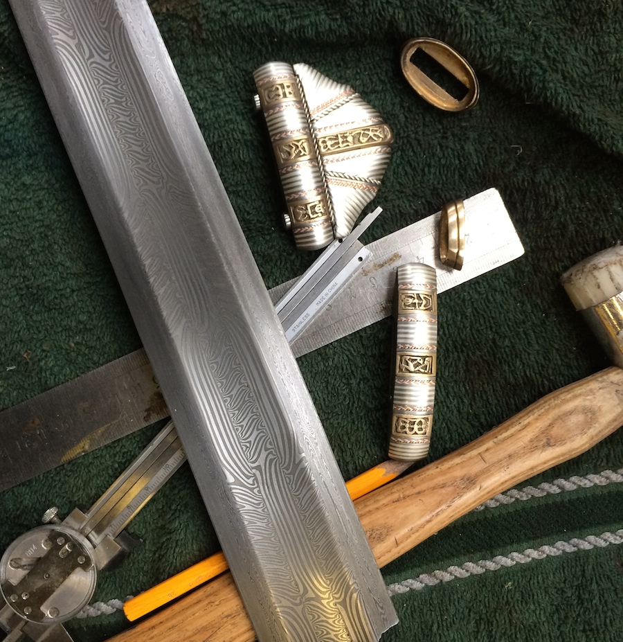 I began by carving the guard and pommel in wax,and this in turn was cast in Bronze.the silver wires were all inlaid and hammered in,along with the intricate gripping beast panels in Bronze.