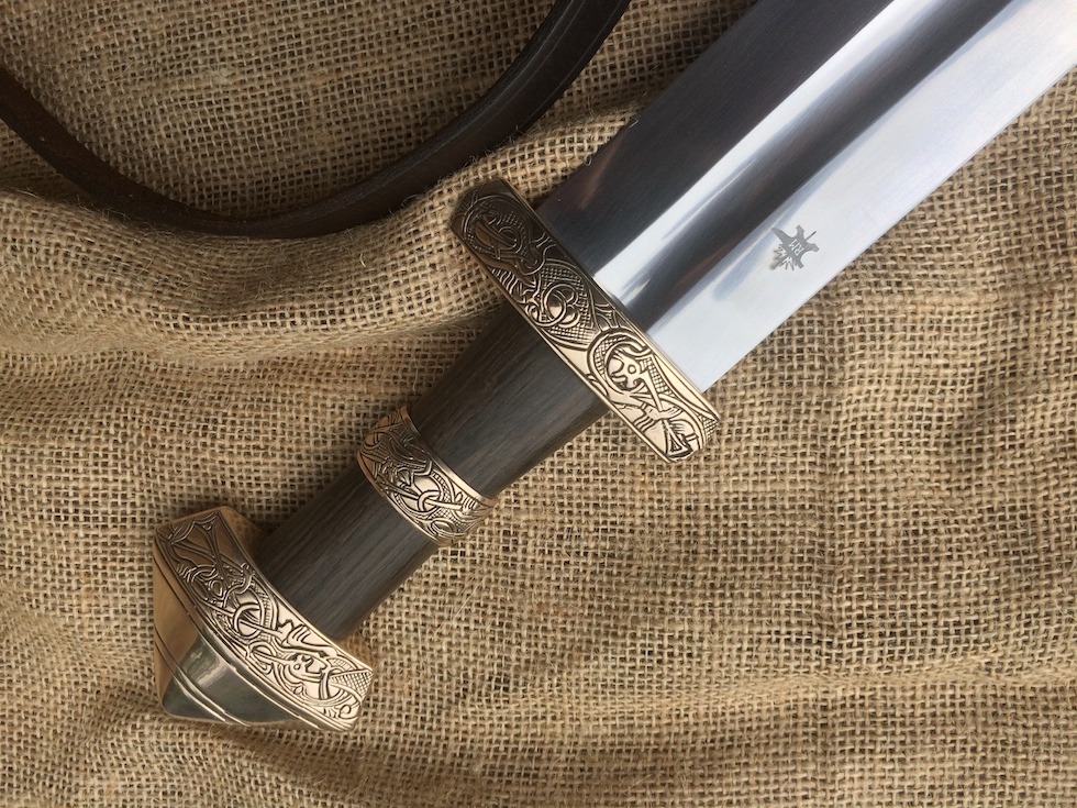 the Bronze fittings feature a very large type H pommel and guard,with grip ring,all carved with figures from the Oseberg burial ship.Hot peened tang.